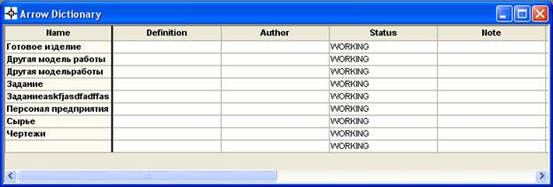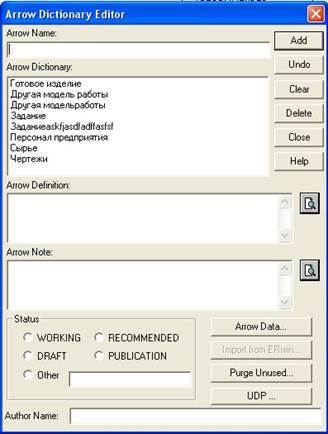 Содержимое словаря стрелок можно распечатать в виде отчета (меню Tools/Reports/Arrow Report) и получить тем самым толковый словарь терминов предметной области, использующихся в модели.