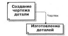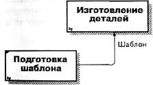 Связь по управлению (output-control), когда выход вышестоящей работы направляется на управление нижестоящей. Связь по входу показывает доминирование вышестоящей работы. Данные или объекты выхода вышестоящей работы не меняются в нижестоящей. На рис. 13 стрелку «Чертеж» связывает работы «Создание чертежа детали» и «Изготовление детали», при этом чертеж не претерпевает изменений в процессе изготовления деталей.