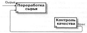 Обратная связь по входу (output-input feedback), когда выход нижестоящей работы направляется на вход вышестоящей. Такая связь, как правило, используется для описания циклов. На рис. 14 стрелка «Брак» связывает работы «Переработка сырья» и «Контроль качества», при этом выявленный на контроле брак направляется на вторичную переработку.
