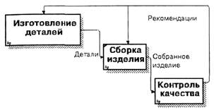 Обратная связь по управлению (output-control feedback), когда выход нижестоящей работы направляется на управление вышестоящей (стрелка «Рекомендации», рис. 15). Обратная связь по управлению часто свидетельствует об эффективности бизнес-процесса. В случае, изображенном на рис. 15, качество изделия может быть повышено путем непосредственного регулирования процессами изготовления деталей и сборки изделия в зависимости от результата (выхода) работы «Контроль качества».