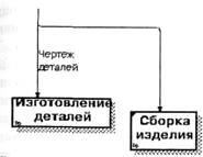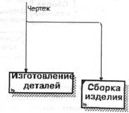 Связь по входу (output-input), когда стрелка выхода вышестоящей работы (далее — просто выход) направляется на вход нижестоящей (например, на рис. 12 стрелка «Детали» связывает работы «Изготовление деталей» и «Сборка изделия»).