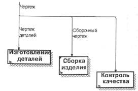 Взаимодействие работ с внешним миром и между собой описывается в виде стрелок. Стрелки представляют собой некую информацию, именуются существительными (например, «Заготовка», «Изделие», «Заказ»).