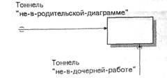 Другим примером тоннелирования может быть ситуация, когда стрелка механизма мигрирует с верхнего уровня на нижний, причем на нижнем уровне этот механизм используется одинаково во всех работах без исключения. (Предполагается, что не нужно детализировать стрелку механизма, т. е. стрелка механизма на дочерней работе именована до разветвления, а после разветвления ветви не имеет собственного имени.) В этом случае стрелка механизма на нижнем уровне может быть удалена, после чего на родительской диаграмме она может быть затоннелирована, а в комментарии к стрелке или в словаре можно указать, что механизм будет использоваться во всех работах дочерней диаграммы декомпозиции. Такое тоннелирование называется "не-в-дочерней-работе" (рис. 21).