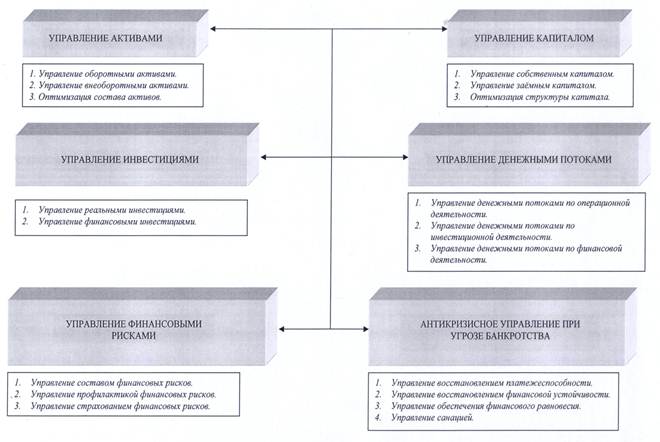 1. Управление активами. Функциями этого управления являются выделение реальной потребности в отдельных видах активов исходя из предусматриваемых объёмов операционной деятельности предприятия и определение их суммы в целом, оптимизация состава активов с позиций эффективности их комплексного использования, обеспечения ликвидности отдельных видов оборотных активов и ускорения цикла их оборота, выбор эффективных форм и источников их финансирования.