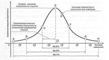 В идеальном случае процесс бенчмаркинга должен выглядеть так, как это показано на схеме (рис. 1.6.). Определяется не только единый, среднеотраслевой показатель, но и разброс показателей по предприятиям области, выраженный значением среднеквадратического отклонения у. На практике получится нечто, напоминающее нормальный закон распределения с собственной асимметрией и эксцессом. Важно установить, где же находится значение для нашего предприятия в совокупности значений предприятий отрасли. Если наше значение соответствует точке Е на рисунке, то это означает, что мы находимся вблизи среднего значения в совокупности 66,6% предприятий отрасли, отклонение показателей которых от среднего не превышает значения ±1у.