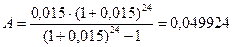 период погашения составляет 2 года (24 месяца), следовательно процентная ставка в расчете на период составит Р = 0,18/12 =0,015.