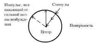 Рисунки 5.1 и 5.2 редуцируют эти процессы до наиболее простых понятий. На рис. 5.1 организм представлен как окружность, что немного напоминает строение единичной клетки. Ее середина соответствует ядру клетки, она является источником энергии для любых движений. Импульс или волна возбуждения движется от центра к границам, где возникает экспрессия. Одновременно снаружи поверхность клетки атакуют стимулы, провоцирующие внутренние реакции.