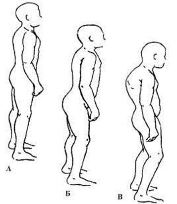 Б Таз отведен назад, что уплощает изгиб в нижней части спины
