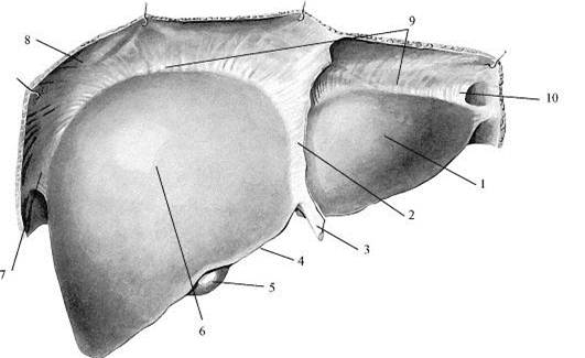 Печень и ее связочный аппарат. Вид спереди и сверху. 1 - левая доля печени, 2 - серповидная связка, 3 - круглая связка печени, 4 - нижний край печени, 5 - желчный пузырь, 6 - правая доля печени, 7 - правая треугольная связка, 8 - диафрагма, 9 - венечная связка, 10 - левая треугольная связка.
