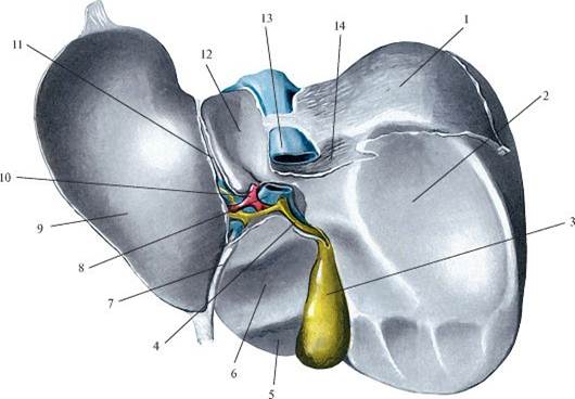 Печень. Вид снизу. 1 - задняя поверхность печени, 2 - почечное вдавление, 3 - желчный пузырь, 4 - пузырный проток, 5 - квадратная доля печени, 6 - двенадцатиперстно-кишечное вдавление, 7 - круглая связка печени, 8 - воротная вена, 9 - желудочное вдавление, 10 - собственная печеночная артерия, 11 - венозная связка, 12 - хвостатая доля печени, 13 - нижняя полая вена, 14 - надпочечниковое вдавление.