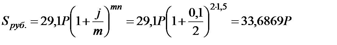 Если же имеющиеся P долларов обменять на рубли, то в соответствии с курсом покупки можно получить 29,1 P руб. Через 1,5 года наращенная сумма на рублевом депозите составит: