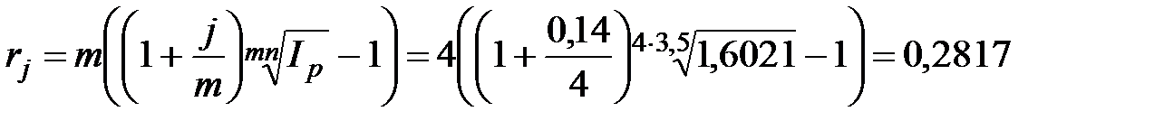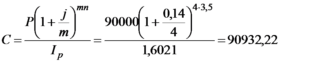 Решение. Имеем: P =90000 руб.; n =3,5 года или 42 месяца, n1 = n2 = n3 =12 месяцев, n4=6 месяцев; h1 =1, h2 =1,1, h3 =1,3, h4 =1,1; m =4; j =0,14.