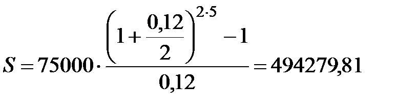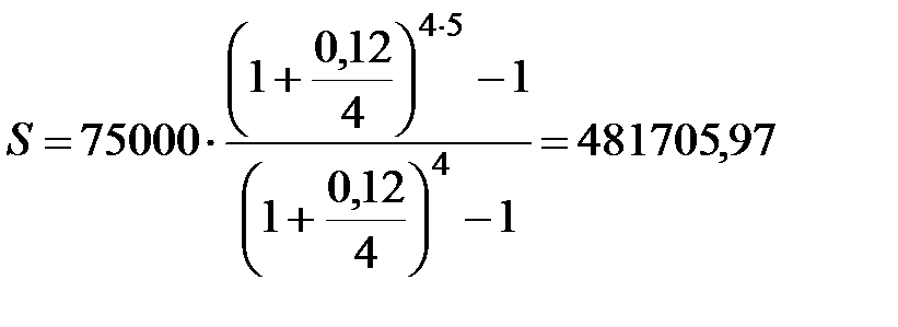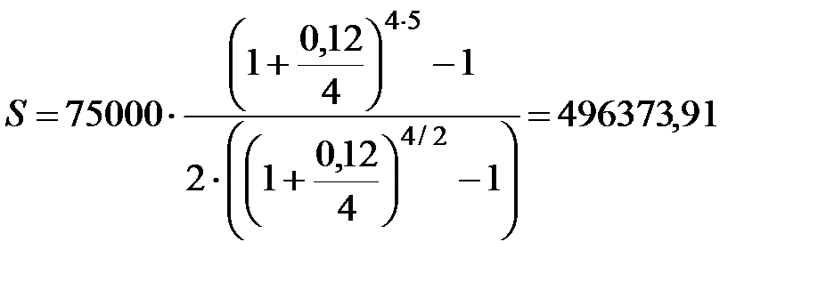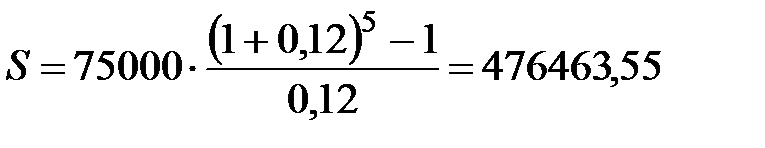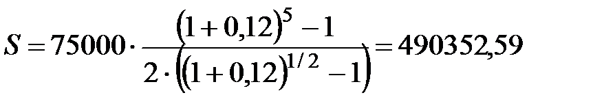 Пример 4.1 Фирма создает инвестиционный фонд. В течение 5 лет в фонд вносятся платежи в размере 75000 руб. в год под 12% годовых. Найти величину инвестиционного фонда через 5 лет, если: 1) платежи осуществляются один раз в году, проценты начисляются один раз в году; 2) платежи осуществляются один раз в году, проценты начисляются ежеквартально; 3) платежи осуществляются по полугодиям, проценты начисляются один раз в году; 4) платежи осуществляются по полугодиям, проценты начисляются по полугодиям; 5) платежи осуществляются по полугодиям, проценты начисляются ежеквартально.