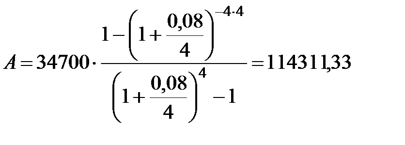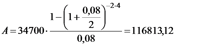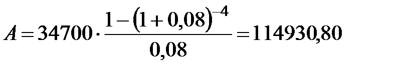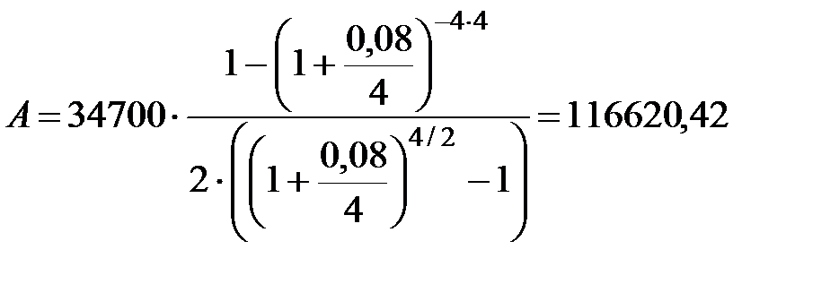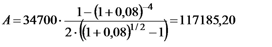 Пример 4.2 Фирма предусматривает создание в течение 4-х лет фонда развития и имеет возможность вносить ежегодно 34700 руб. под 8% годовых. Какая сумма потребовалась бы фирме изначально для создания фонда, если бы она поместила ее в банк на 4 года под 8% годовых, если: 1) платежи осуществляются один раз в году, проценты начисляются один раз в году; 2) платежи осуществляются один раз в году, проценты начисляются ежеквартально; 3) платежи осуществляются по полугодиям, проценты начисляются один раз в году; 4) платежи осуществляются по полугодиям, проценты начисляются по полугодиям; 5) платежи осуществляются по полугодиям, проценты начисляются ежеквартально.