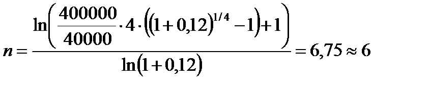 Пример 4.3 Какой срок необходим для накопления 400 тыс. руб., если ежеквартально будет вноситься 10 тыс. руб. под 12 % годовых при ежегодном начислении процентов?