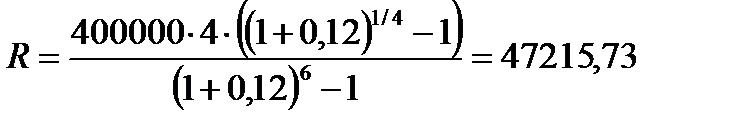 Решение. Так как величина наращенной суммы S=400 тыс. руб., число начислений процентов в году m = 1, рентные платежи вносятся ежеквартально (p=4), а R-величина годового взноса составляет
