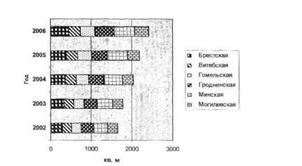 Рисунок Б.2 — Ввод в действие жилых домов по областям (на 1000 человек населения; квадратных метров общей площади)