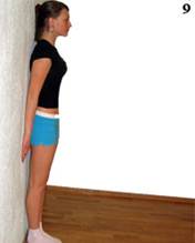 v Встаньте у стены прямо, пятки и носки вместе, руки опущены. Выпрямите спину, сблизьте лопатки, подтяните живот. Голова чуть приподнята, глаза смотрят немного выше линии горизонта. Равномерно распределите вес тела.