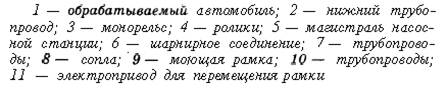 Трубопровод 2 с трехрядным расположением сопел, проложенный снизу вдоль моечной установки, служит для мойки низа автомобиля. Шарнирные соединения 6 обеспечивают угловой поворот трубопроводов 7 и 10 при перемещении моющей рамки из первоначального положения в конечное; при этом осуществляется мойка внутренних поверхностей кузова автомобиля.