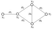 В изображенном на рис. 3.5 графе рассмотрим два маршрута из вершины x 1в вершину x 4: M 1= (a 1, a 2, a 4) и M 2= (a 1, a 2, a 5, a 6). Длина маршрута M 1 равна 3, а длина маршрута M 2 равна 4.