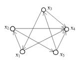 У ориентированного графа, изображенного на рис. 3.9 две компоненты сильной связности. Первая компонента связности включает вершины x 1, x 2, x 3, x 5,а вторая состоит из одной вершины x 4. Действительно, для любой пары вершин из множества { x 1, x 2, x 3, x 5}существует хотя бы один путь, соединяющий эти вершины. Например, путь (x 1, x 2, x 5, x 3, x 1) соединяет все эти вершины. Из вершины x 4 нет пути ни в одну вершину графа.