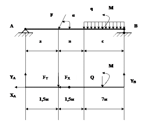 Рассмотрим равновесие балки АВ (рис. 7.). Выбираем координатные оси XY. Отбрасываем опоры и заменяем их реакциями. Реакцию в неподвижной опоры в точке А разложим по осям координат на составляющие XА и YА, реакцию подвижной опоры направим перпендикулярно опорной поверхности катков, в противоположную сторону действия внешних сил. Равномерно распределенную нагрузку интенсивности q заменим равнодействующей силой Q= q∙c и приложим ее в середине участка, на котором действует нагрузка. Наклонную силу раскладываем на составляющие FX= F∙cos α и FY= F∙sin α.