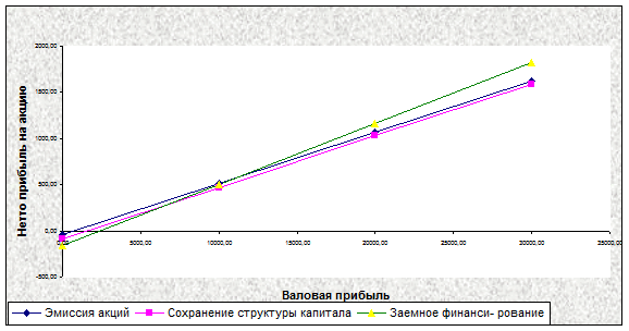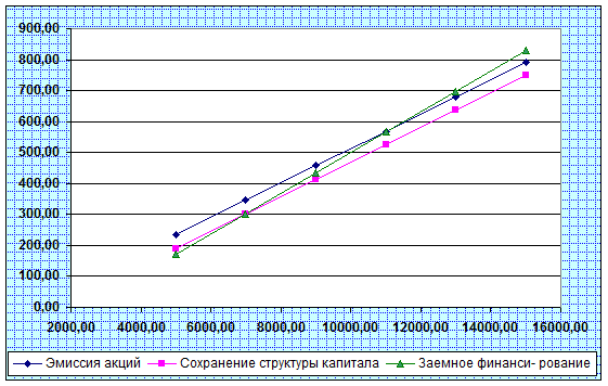 Таким образом, на основе проведенных расчетов и графического анализа можно сделать вывод, что в данном случае предпочтительным вариантом финансирования инвестиций в объеме 10000 является финансирование за счет свободных денежных средств (3325,50 тыс.рублей и эмиссии акций
