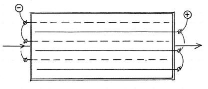 Большинство устройств для очистки воды электрокоагуляцией является безнапорными пластинчатыми электролизерами горизонтального или вертикального типа. Пластины металла располагаются вертикально на расстоянии 3...20 мм друг от друга и удерживаются изолирующими вставками, электрический ток подводится к каждой пластине (рис. 4.2).