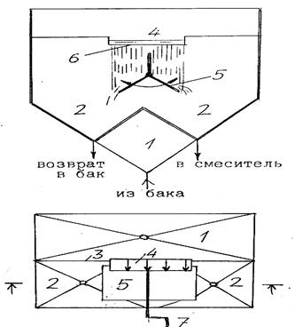 Рис. 4.7. Бункерный дозатор: 1 - большой бункер, 2 - малые бункеры, 3 - перегородки, 4 - перелив, 5 - делитель потока; 6 - плоская струя, 7 - рукоятка.