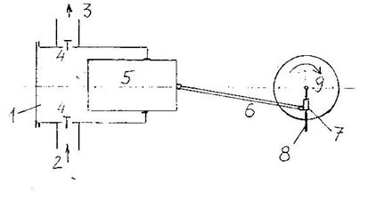Рис.4.8. Схема плунжерного насоса-дозатора: 1 - рабочая камера, 2 - всасывающий патрубок, 3 - нагнетательный патрубок, 4 - клапана, 5 - плунжер, 6 - рычаг, 7 - кулиса, 8 - шток, 9 - вал.