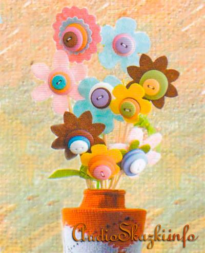 Попробуй сделать красивый букет. Вырежи цветочки из бархатной бумаги или яркого фетра. Сшей их вместе с пуговицами. Приклей к деревянным шпажкам.