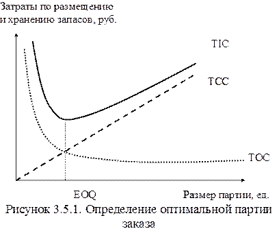 Очевидно, что изменения TIC имеют определенный характер: часть затрат увеличивается с ростом объема запасов, в то время как другая снижается. Затраты по хранению увеличиваются с ростом объема заказов, а по размещению и выполнению - снижаются с увеличением размеров партии и т.п. Данная зависимость показана на рисунке 3.5.1, который иллюстрирует модель определения оптимальной партии заказа.