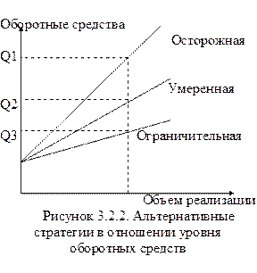 По своей природе краткосрочные финансовые решения сходны с долгосрочными, и часто происходят в рамках дилеммы: риск или доходность. Различают три альтернативные стратегии в отношении уровня оборотных средств: осторожную, умеренную и ограничительную. Они отличаются только объемом оборотных средств, которые фирма считает необходимым иметь для обеспечения заданного уровня производства (см. рис. 3.2.2).