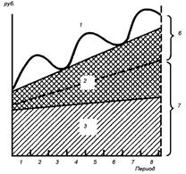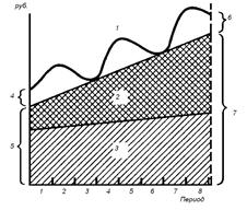 1 - Флуктуация оборотных средств; 2 - постоянная часть оборотных средств; 3 - основные средства; 4 - переменная часть оборотных средств; 5 - постоянные активы; 6 - краткосрочные кредиты и займы; 7 - долгосрочные пассивы плюс собственный капитал плюс спонтанная кредиторская задолженность; 8 - ликвидные ценные бумаги; 9 - потребность в краткосрочном финансировании.