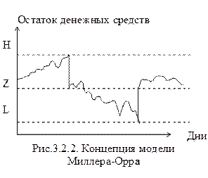 В данной модели определяется верхний (Н) и нижний (L) пределы колебаний остатка денежных средств, а также их целевой остаток (Z). Когда остаток денежных средств достигает величины Н, фирма должна покупать ценные бумаги на сумму (Н-Z), когда остаток денежных средств достигает уровня L - продавать их на сумму (Z-L). Нижний предел L определяется руководством фирмы эмпирически в зависимости от приемлемого уровня потерь в связи с нехваткой денежных средств, остальные параметры рассчитываются по формулам: