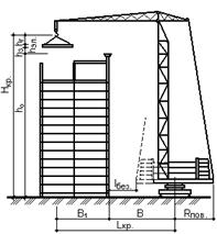 Минимальная требуемая высота подъема крюка крана определяется из возможности монтажа оборудования, элемента, узла или блока, расположенных на самой высокой отметке сооружения. Из рис. 1 видно, что