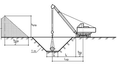 Вылет крюка кранов, устанавливаемых вблизи котлованов и траншей, определяют из условий наименьшего допустимого расстояния от бровки котлована до ближайшей опоры крана, глубины заложения и габаритов монтируемых элементов. Из рис. 1, в следует