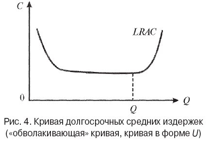 Обычно кривая долгосрочных средних издержек представляет собой сочетание всех трех приведенных выше кривых. Это связано с тем, что сначала по мере роста масштабов производства средние издержки убывают, затем некоторое время остаются постоянными и, наконец, всегда существует некоторый момент, после которого дальнейшее наращивание объема производства вызывает рост средних издержек (рис. 4).