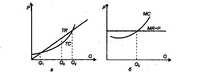 Рис. 11.3. Выбор объема производства фирмой путем сопоставления валовых (а) и предельных (б) доходов и издержек: ТС — валовые издержки; TR — валовой доход; МС — предельные издержки; MR — предельный доход