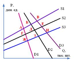 На графике представлены варианты рыночного равновесия при пересечении разных кривых спроса и предложения на вторичном рынке мебели. Рыночное равновесие установилось в точке Д.