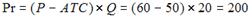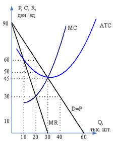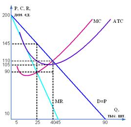 В данном случае оптимальный для фирмы уровень цены равен 60 ден. ед., поскольку предельный доход и предельные издержки становятся равными при Q = 20 тыс. шт. Средние издержки (АТС) для данного объема составляют 50 ден. ед., тогда величина прибыли может быть рассчитана так: