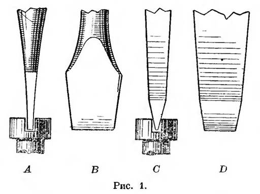 Для чистки, а также для приспособления к опытам физические приборы часто приходится разбирать и собирать. Для этого необходимо иметь набор специальных инструментов, главным образом коллекцию отвёрток. Различные части почти всегда скрепляются винтами с головками, снабжёнными разрезом для (66) отвёртки. Если отвёртка по ширине и форме конца нехорошо подходит к винту, то его легко повредить при отвинчивании. Разрезы на головках винтов в физических приборах бывают обыкновенно тонки и довольно глубоки (рис. 1), поэтому конец отвёртки должен быть клинообразен (рис. 1, А и В). Отвёртки, употребляемые столярами (рис. 1, C и D), заточены обыкновенно двумя фацетками под довольно тупым углом и почти заострены; такой конец крепок и может входить в разрезы разной толщины, но легко портит головку. Для отвинчивания надо, вставив конец отвёртки в разрез головки винта, сильно нажать её и в то же время повёртывать.