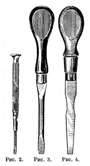Если нажатие недостаточно, отвёртка выскочит и повредит при этом края разреза; наклонные фацетки способствуют выскакиванию и требуют более сильного нажима, тогда как почти параллельные поверхности правильно сделанной отвёртки не вызывают выталкивающей силы во время усиленного вращения. Поэтому жалеющий приборы должен не жалеть денег на приобретение коллекции отвёрток, от самой маленькой до самой большой. Маленькие (рис. 2) можно найти в магазинах часовых принадлежностей, побольше – там, где продают швейные машины и ружья. В хороших инструментных лавках тоже имеются отвёртки, годные для физических приборов (рис. 3), а предназначаемые для столяров (рис. 4) не годятся для этой цели, хотя их тоже надо иметь для завинчивания больших обыкновенных винтов в дерево, для чего «настоящие» отвёртки окажутся слабыми.