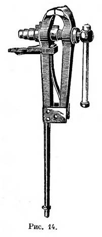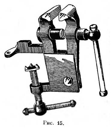 В настоящее время существует множество конструкций тисков. Рисунок 14 изображает обыкновенные стуловые тиски: их привинчивают к верстаку, а хвост упирают в пол или особую деревяшку, прикреплённую к ноге верстака. В так называемых (85) «французских» тисках хомутик, охватывающий одну половину и укрепляемый к верстаку, позволяет повёртывать тиски около вертикальной оси, что иногда очень ускоряет и облегчает работу. Такого же рода шарнирные тиски делают и гораздо меньших размеров, снабжая их скобой с нажимным винтом, чтобы привинчивать к столу (рис. 15). Большие тиски такого рода называются «ремонтными», а маленькие, употребляемые часовщиками, носят название «шубстак» (с немецкого: Schraubstock).