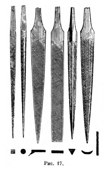 Надо употреблять новые напилки сначала для дерева и латуни, потому что достаточно немного поработать напилку на стали или железе, чтобы он начал скользить по латуни с весьма слабым результатом. Для скорости надо начинать работу драчёвым напилком и кончать средним или даже личным. Драчёвые напилки надо оберегать от масла, чтобы они не скользили по металлу. Когда они начинают скользить, их натирают куском древесного угля или мела. Это натирание также почти устраняет приставание частичек металла к поверхности напилка. (Частицы эти замедляют работу и производят глубокие царапины.) Личные напилки, напротив того, смазывают обильно маслом, чтобы частицы металла не приставали, и чтобы поверхность получалась гладкая. Приставшие частицы удаляют углом кусочка листового железа. Кроме плоских напилков, полезно иметь несколько круглых разного диаметра, пару полукруглых, небольшой квадратного сечения и трёхгранный. Маленькие напилочки называются «надельфейли»; их делают из круглой стальной проволоки, и часть её служит рукояткой.