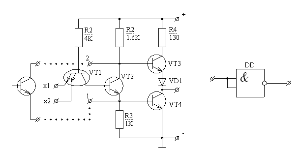 Основу современных цифровых устройств составляют интегральные логические элементы ЛЭ, одним из которых является элемент “2И-НЕ ” (рис. 1.1). ЛЭ “2И-НЕ ” представляет собой ключ, имеющий 2 входа, 1 выход и реализующий функцию отрицания логического произведения входных сигналов. Принципиальная схема ТТЛ ЛЭ и его условное графическое обозначение УГО приведены на рис. 1.1. Это универсальный элемент с помощью которого, в сочетании с логической парой “ИЛИ-НЕ”, возможно построение любой логической системы.