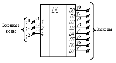 Дешифратором называется устройство, распознающее кодовые комбинации. Дешифратор имеет число входов, равное разрядности принимаемого кода n, и число выходов, равное возможному числу кодовых комбинаций N = 2n. Такое устройство вырабатывает сигнал “1” на каждом выходе только в том случае, когда на вход поступает код числа, соответствующего номеру этого выхода. Дешифратор (рис. 2.1) является полным, т.е. имеет восемь выходов, соответствующих 3х разрядному коду числа. На рис. 2.1 приведено условное графическое обозначение дешифратора, которое используется в структурных, функциональных и принципиальных схемах.