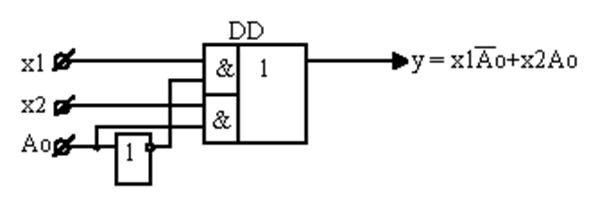 Набор сигналов на адресном входе определяет соединение информационных входов с выходом. Например, мультиплексор с двумя информационными входами 2x1 можно реализовать следующим образом: