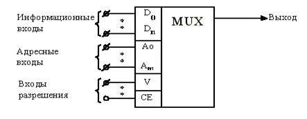 Мультиплексор (коммутатор) – устройство для переключения в определенном порядке сигналов с нескольких входов на один выход. Во многих схемах мультиплексор выполняет функцию многопозиционного переключателя. Управление мультиплексором производится по адресным и разрешающим входам. Число информационных входов N связанно с числом адресных входов n следующим выражением N = 2n.
