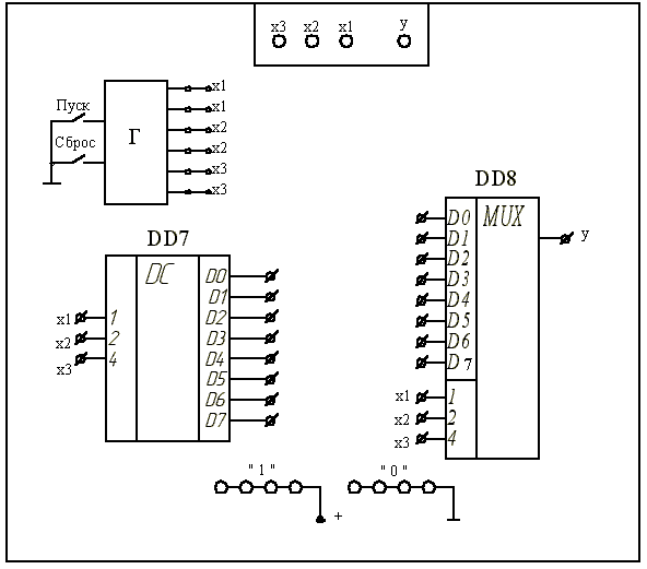 3. Исследовать функционирование мультиплексора DD8. Т.к. для серии ТТЛ свободный вход соответствует уровню логической “1”, то следует поочередно подключать низкий уровень (“0”) на соответствующий информационный вход. С помощью соединительных проводов подключить индикатор “У” к выходу мультиплексора и, нажимая кнопку “Пуск”, фиксировать по индикаторам x1, x2, x3 состояния адресных входов, а по индикатору “У” – выхода мультиплексора. Данные занести в табл. 2.2.